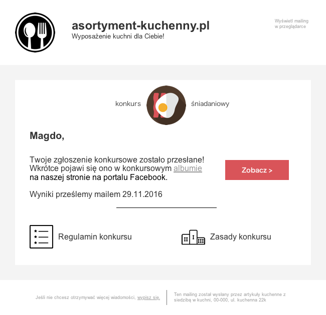 „Dziękujemy, że wziąłeś udział w naszym konkursie. Będziemy wysyłać Ci najlepsze okazje i najciekawsze kulinarne treści w naszym newsletterze. Jeśli nie chcesz, możesz się wypisać – ale pewnie będziesz żałować :)”