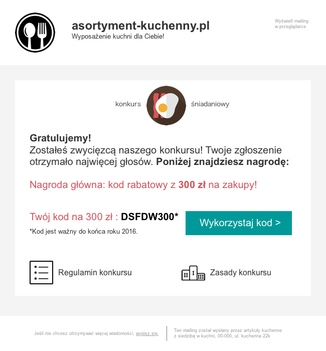 Pora ogłosić wyniki konkursu. Wysyłamy mailing (#4) do naszych odbiorców, który poinformuje ich o tym, czy wygrali, czy nie. Oczywiście, jak to zwykle bywa w konkursach, wygranych jest znacznie mniej. Do nich kierujemy krótką informację z podziękowaniem i dalszymi informacjami odnośnie nagrody – w naszym przypadku wysyłamy im bon na 300 zł na zakupy w sklepie.