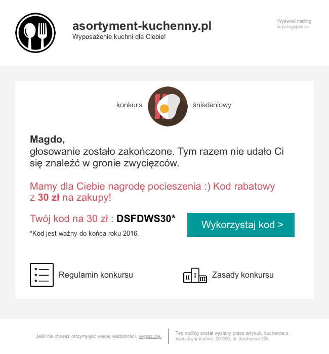 Bardzo ważne jest to, co wysyłamy całej reszcie. Nie chcemy przecież, aby fakt przegranej odsunął ich od naszej marki. Wyślijmy im nagrodę pocieszenia, np. w postaci bonu: