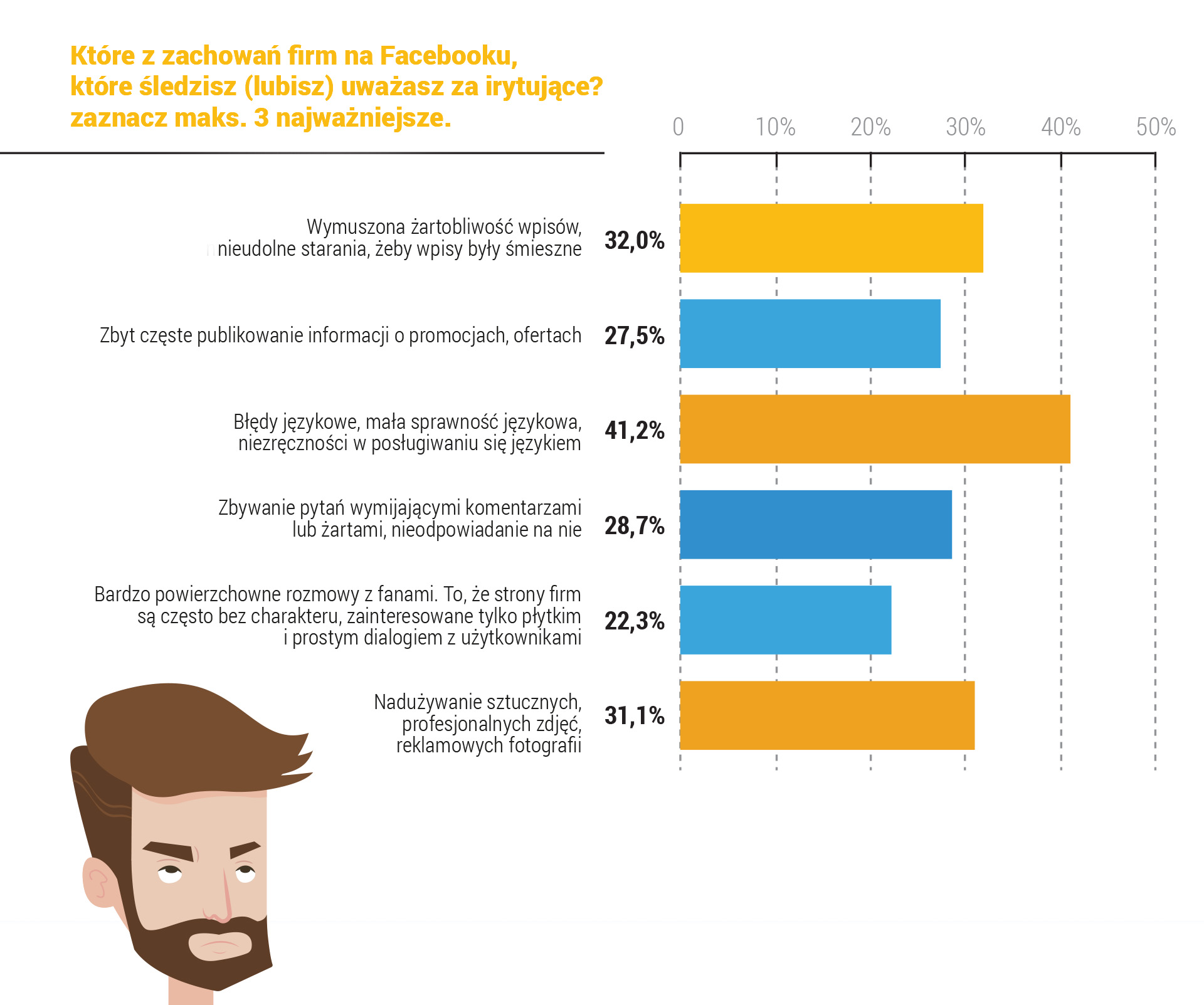 Co jeszcze irytuje osoby obserwujące profile firm na Facebooku? Tuż za błędami językowymi plasuje się wymuszona żartobliwość wpisów i nieudolne starania, by były one śmieszne (32%). W pierwszej trójce niepożądanych zachowań znalazło się również nadużywanie sztucznych, profesjonalnych zdjęć, co za rażące uważa 31% badanych.