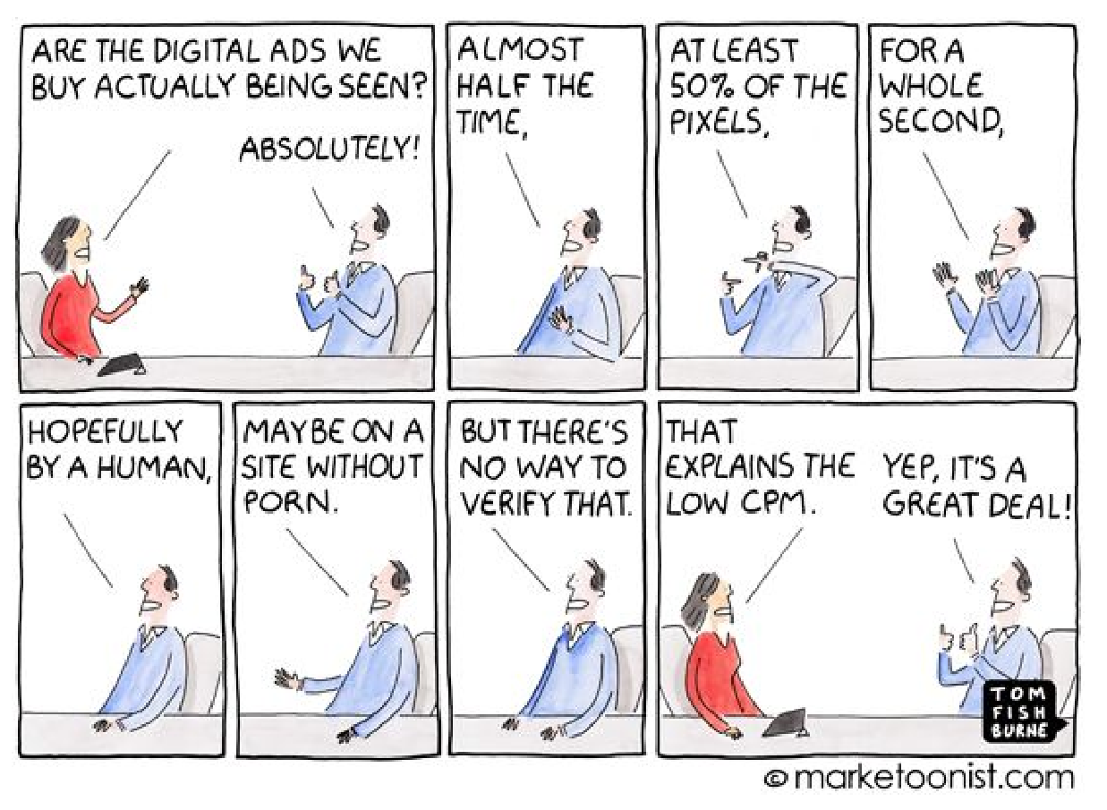 Wyzwaniem dla branży jest przede wszystkim tworzenie szczerej relacji z klientem. W 2016 r. był przypadek przyznania się Facebooka do nieprawidłowych statystyk nt. video. Ponadto, poniższy obrazek przedstawia różne aspekty zakupu reklam w Internecie.