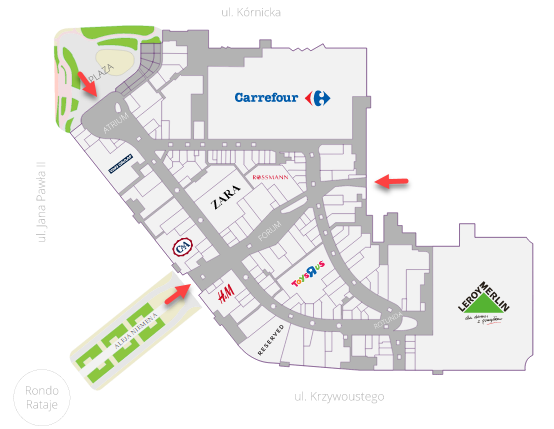 Pomimo dobrej czytelności mapy, która dostępna jest na stronie internetowej, w aplikacji mobilnej, a także w samym centrum handlowym, wejścia do obiektu nie są oznaczone. Chociaż dwa z nich zdecydowanie się wyróżniają za sprawą charakterystycznych alei, możliwości dotarcia do obiektu jest więcej, co niestety nie zostało wskazane. Utrudnia to klientom wybór najbardziej odpowiedniego, zmuszając do poszukiwań.