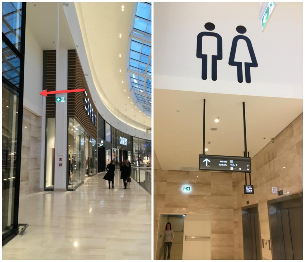Rekomendacja: dodanie informacji o toaletach, np. zwisających z sufitu piktogramów, widocznych z alei.