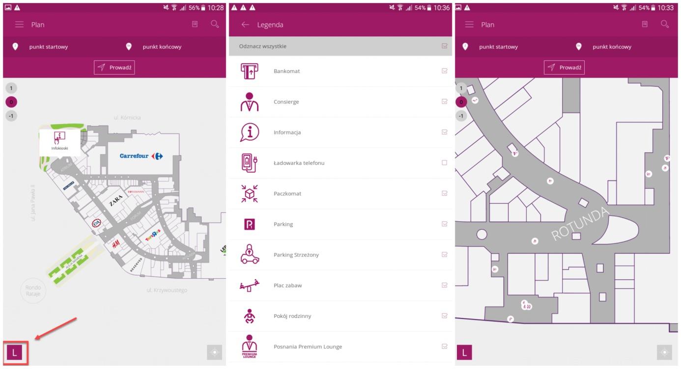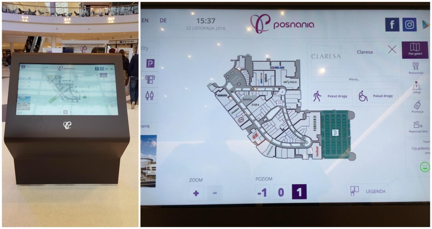 Interaktywne standy informacyjne są proste w obsłudze i spójne z całą identyfikacją wizualną. Informują o aktualnym położeniu klienta oraz dostępnych usługach. W trzech krokach można znaleźć drogę do wybranego lokalu usługowego. Dodatkowo, trasa wskazywana jest przy pomocy krótkiej animacji, która dobrze ukazuje jej przebieg. Co ciekawe, istnieje także możliwość wyboru drogi dla osoby niepełnosprawnej – w tym wypadku, gdy konieczna jest zmiana kondygnacji, omijane są schody a wskazywane najbliższe windy. Wydaje się jednak, że jest to jedyne udogodnienie dla niepełnosprawnych, o czym pisze Sylwia Błach na swoim blogu w artykule CH Posnania dostępne dla niepełnosprawnych – serio?!