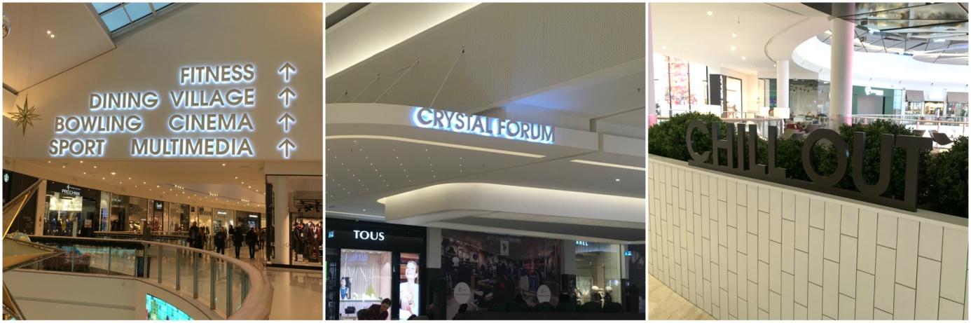 W centrum znajduje się kilka stref, m.in. Crystal Forum, Premium Lounge, Dining Village.  Oferowane są także usługi jak Handsfree Shopping czy Collect & Try. Używanie angielskich nazw z jednej strony dodaje wrażenia ekskluzywności, z drugiej jednak wprowadzać może zakłopotanie u osób nieznających obcego języka.