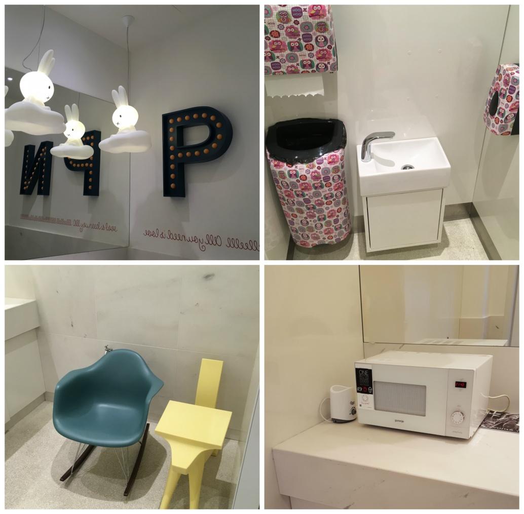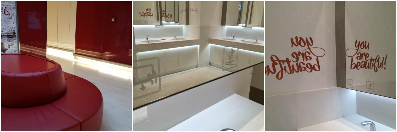 Także łazienki stanowią osobne strefy – każda z nich różni się kolorami, znajduje się tu także miejsce do odpoczynku. Na lustrach zostały umieszczone przydatne ikony, które informują o umiejscowieniu mydła, papieru do rąk czy balsamu. Żartobliwą dekoracją są hasła na ścianach napisane w lustrzanym odbiciu.