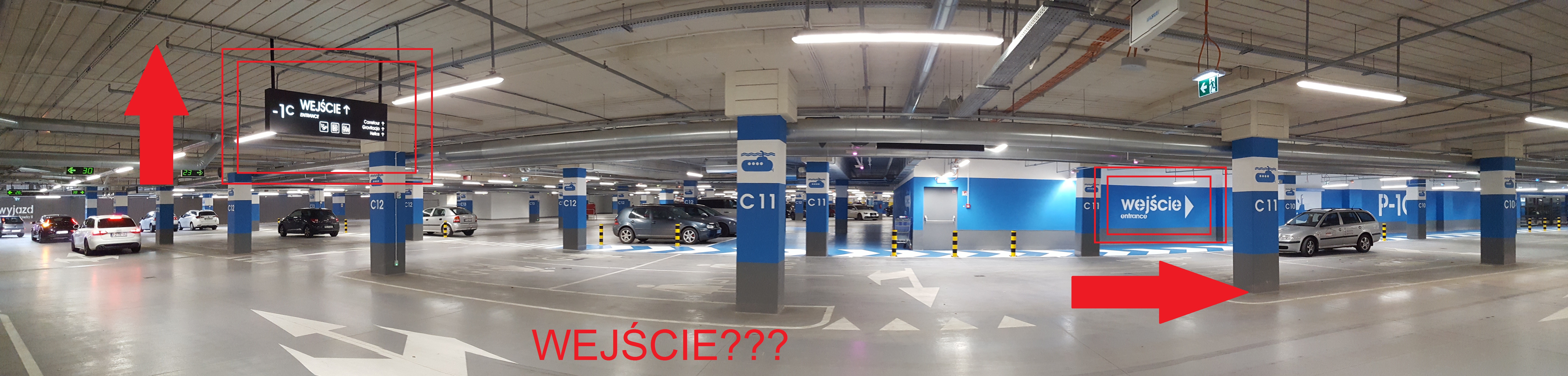 Kierunkowskazy wskazujące wejście do centrum, zwrócone są w różnych kierunkach. Po wybraniu drogi z lewej strony, pomimo przejścia sporego odcinka, nie znaleźliśmy kolejnych wskazówek dotyczących wejścia, a także samych drzwi wejściowych. Natomiast strzałka w prawo szybko prowadzi do rzeczywistego wejścia do obiektu. Taka niespójność może powodować irytacje, utrudnia i znacznie wydłuża dotarcie do centrum.