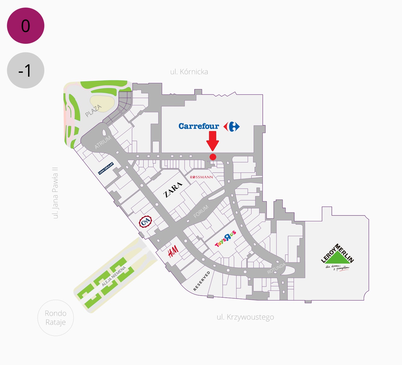 Znajdujący się w centrum supermarket Carrefour udostępnia klientom duże, sklepowe wózki. Chociaż można udać się z nim na parking, nie ma tam przeznaczonego stanowiska na zwrot czy też wypożyczenie wózka. Klienci przyzwyczajeni do lokalizacji takich punktów na parkingach, zmuszeni są do poszukiwań, które zakończą się niepowodzeniem, a także do pozostawienia wózka w dowolnym miejscu. Jest to nie tylko niekomfortowe – może też zagrażać bezpieczeństwu.