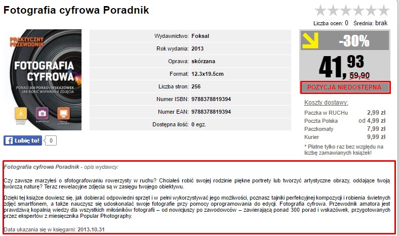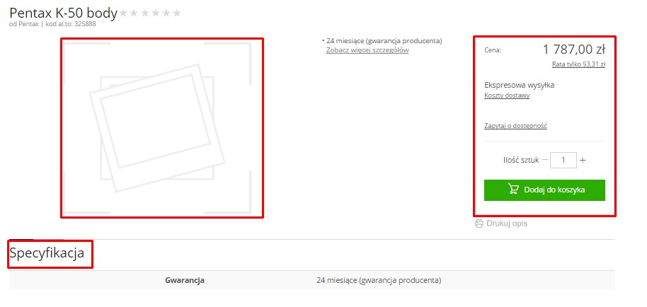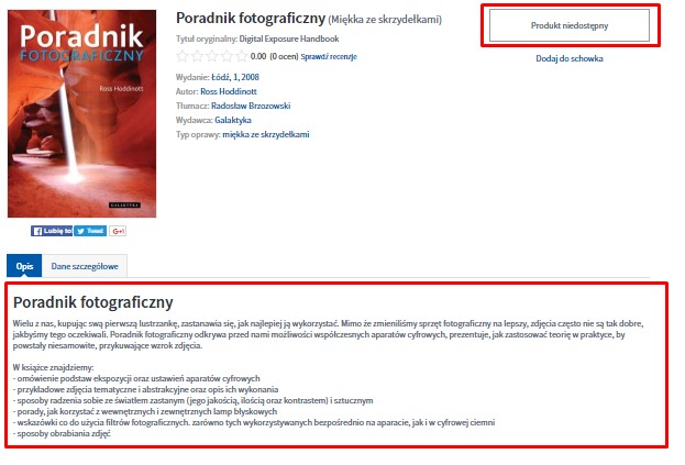 Przykład strony, na której znajduje się dokładny opis produktu, ale zakup jest niemożliwy