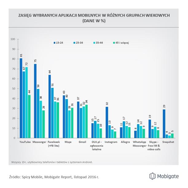 Jak wynika z badania Spicy Mobile, najpopularniejszą aplikacją w każdej grupie wiekowej jest YouTube. Korzysta z niej aż 81 proc. użytkowników smartfonów i tabletów z systemem Android w wieku 15-24 lata. Wśród starszych osób (45 lat i więcej) zasięg tej aplikacji jest blisko o połowę niższy i wynosi 44 proc.