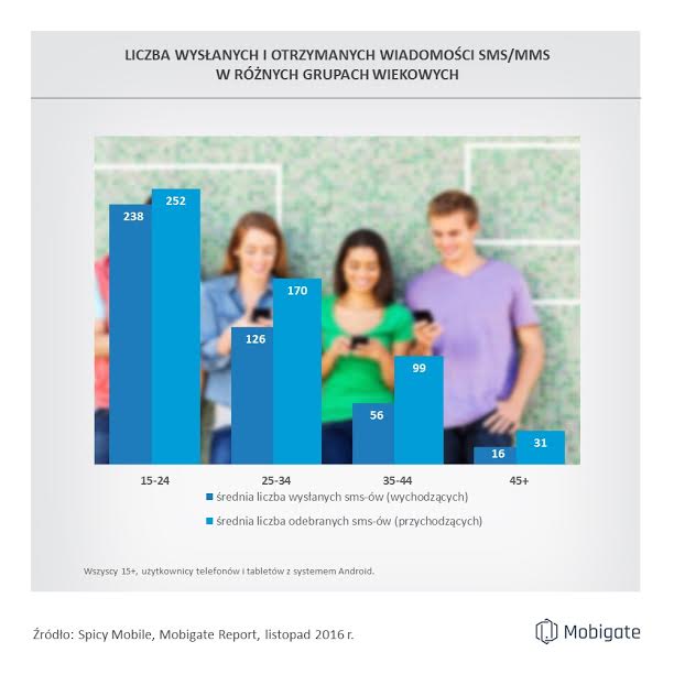 Co ciekawe, powszechne korzystanie z aplikacji społecznościowych i komunikacyjnych wśród młodych osób nie wpływa na mniejszą liczbę wysyłanych przez tę grupę SMS-ów. Jest wręcz odwrotnie! Generacja Z to pokolenie nastawione na komunikację tekstową. Badania Spicy Mobile pokazują wyraźnie, że młodzi użytkownicy wysyłają o wiele więcej wiadomości SMS i MMS niż osoby starsze. Dla porównania, w listopadzie 2016 r. osoby w wieku 15-24 lata wysłały średnio 238 wiadomości SMS/MMS, starsi użytkownicy (45 lat i więcej) – jedynie 16. W przypadku połączeń telefonicznych nie odnotowano aż tak głębokich różnic.