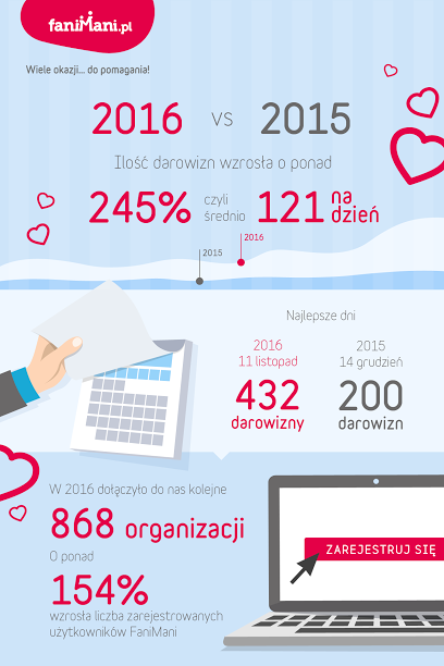 Serwis FaniMani.pl działa już od ponad 2 lat, przy czym cały czas prężnie się rozbudowuje i zwiększa swoje zasięgi stale docierając do nowych odbiorców. Do FaniMani.pl w ciągu ostatniego roku dołączyło kolejnych 868 organizacji pozarządowych, tworząc tym samym pokaźne grono ponad 2700 beneficjentów serwisu. Liczba nowo zarejestrowanych użytkowników będących klientami ponad 800 współpracujących sklepów, wzrosła o ponad 154 % względem 2015 r.