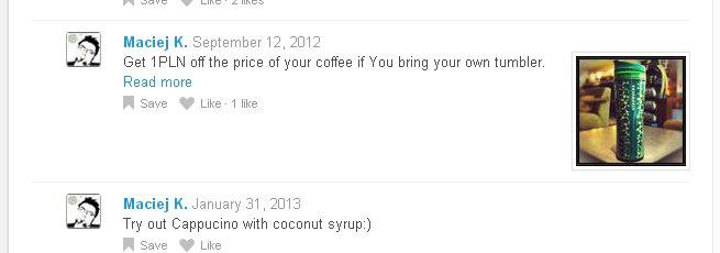 Z komentarzy na profilu jednego ze szczecińskich Starbucksów można się dowiedzieć, że kawiarnia oferuje zniżkę 1 zł jeśli przyjdzie się z własnym kubkiem.