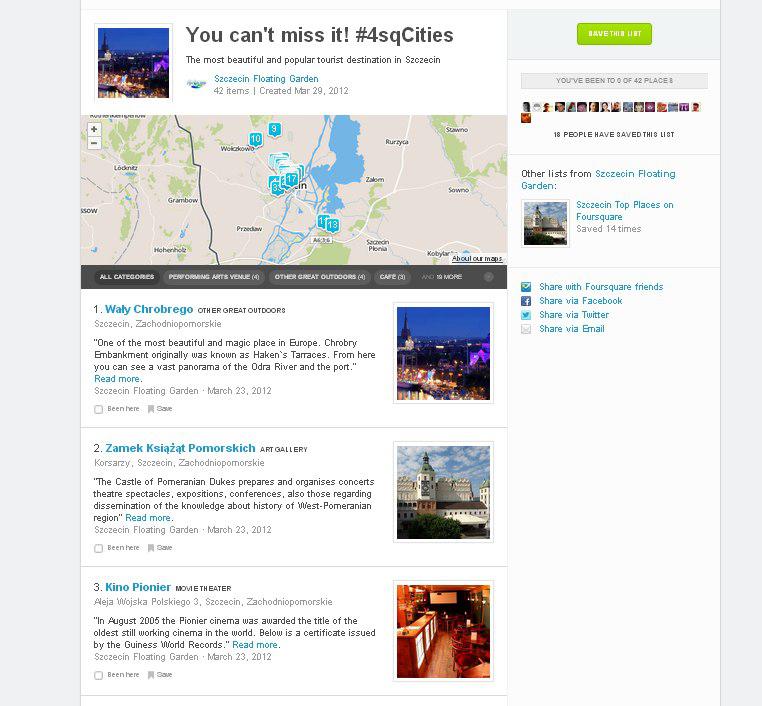 Platforma umożliwia tworzenie list ulubionych miejsc pasujących do wybranej kategorii. Cechy kwalifikujące miejsce do danej listy są ograniczone jedynie wyobraźnią jej twórcy. Możemy zestawić najlepsze puby, rekomendowane miejsca do wypicia kawy czy do wyjścia na spacer z psem, spisy miejsc oferujących szczególne funkcje, np. dostęp do Wi-Fi, kącik zabaw dla dzieci, ciche miejsca umożliwiające spokojne czytanie książek albo miejsca warte sfotografowania – sami możemy zdecydować jak wąska lub szeroka będzie kategoria. W zależności od charakteru naszej branży albo przyjętej strategii możemy stworzyć listę obejmującą jedynie obiekty należące do nas, ale nie ma przeciwskazań do tworzenia zestawień miejsc, którymi nie zarządzamy. Opracowanie listy takich miejsc może być bardzo cenne dla społeczności Foursquare. Tworząc je nasza marka dostarcza użytkownikom użytecznych informacji, a tym samym zaczyna stanowić ważną rolę w życiu konsumenta.