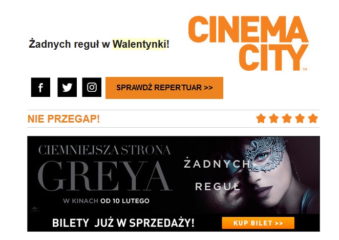 Wlentynki to także czas, gdy zakochane pary wybierają się na romantyczne filmy. Sieci kin z wyprzedzeniem przypominają o specjalnych, walentynkowych seansach, np. Cinema City zachęca do zakupu biletu na nową część serii filmów o Grey’u. Przy zakupie wejściówki na film można także skorzystać z innych promocji oferowanych przez kino.