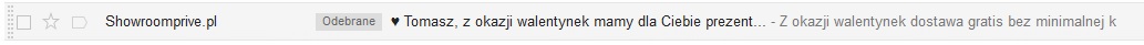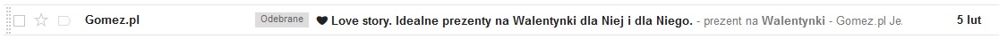 W okresie przedwalentynkowym newslettery pełne są tytułów zawierających nawiązania do miłości. Nagłówek może odnosić się do okazji zrobienia prezentu drugiej osobie, jak np. w wiadomości sklepu internetowego Gomez.pl.
