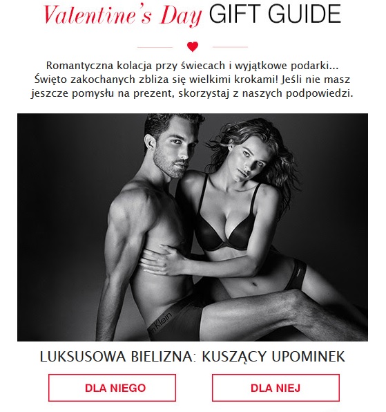 Warto zwrócić także uwagę na kampanie sprzedażowe, ponieważ w Walentynki często kupujemy podarunki drugiej osobie. Najwięcej propozycji prezentowych wysyłają perfumerie oraz sklepy z ubraniami. Perfumy.pl zachęca do zakupu seksownych zapachów w cenach, które można „pokochać”.