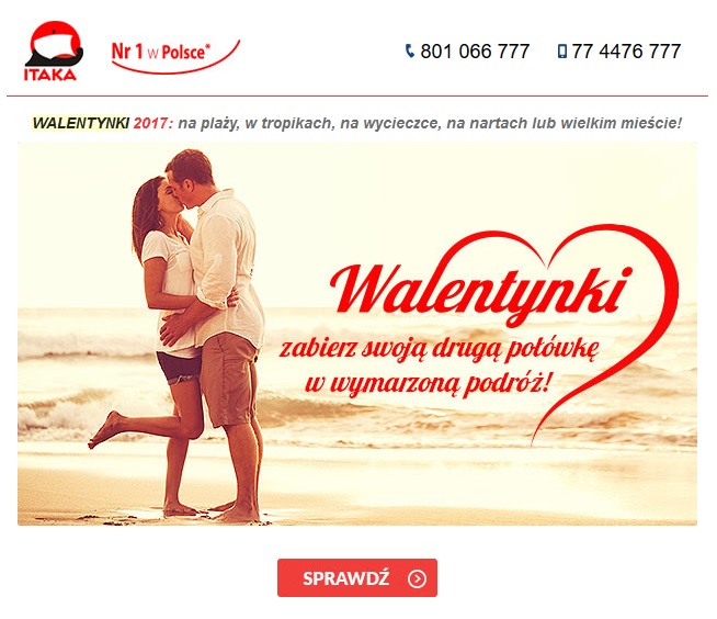 Inne podejście do tego święta wykazują biura podróży, które zachęcają do zorganizowanych wyjazdów, by w okresie Walentynek skupić się całkowicie na drugiej połówce i nie mieć niczego innego na głowie. Takie podejście w newsletterze podsuwa ITAKA.