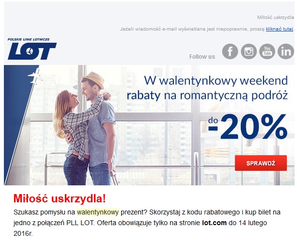 Podczas święta zakochanych, branżą której reklamy są najbardziej widoczne jest turystyka. Marki różnie podchodzą do tej kategorii. Polskie Linie Lotnicze LOT zachęcają do indywidulanych podróży poprzez promocję oraz zniżki na bilety w okresie lutowym.