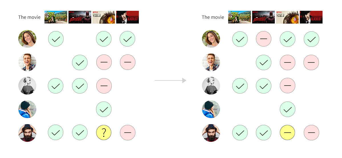 Część klientów sklepu X oceniło produkt Y pozytywnie, a część negatywnie. Posiadając takie informacje na temat różnorodności klientów sklepu X, dzięki uczeniu maszynowemu można przewidzieć ocenę produktu Y przez osoby, które jeszcze nie miały styczności z tym produktem. To umożliwia automatyczne wytypowanie klientów, którym produkt Y może się szczególnie spodobać i wysłanie im e-maila z ofertą tego produktu. Właśnie tak działa Netflix (zobacz obraz 2.)