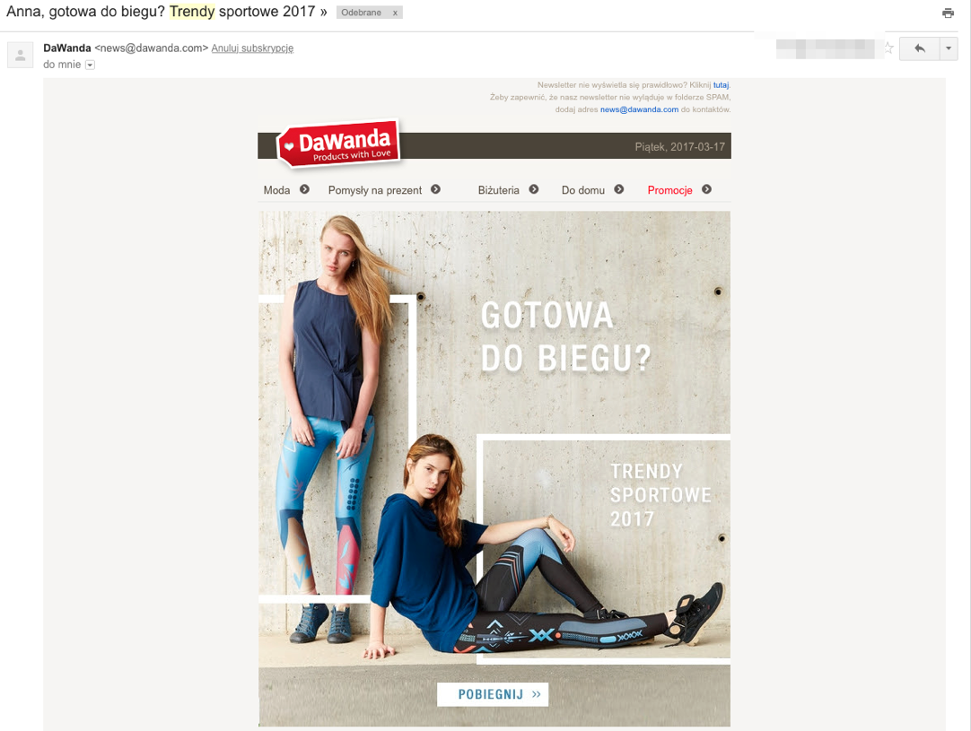 - obwieszczenia, np. „Anna, odbierz swój kod rabatowy już dziś”. Niestety, tego rodzaju treści są często odbierane przez klientów jako spam lub próba wyłudzenia. Poza tym, niespełnienie obietnicy pojawiającej się w temacie może prowadzić do zerwania przez odbiorcę komunikacji z marką. Może okazać się bowiem, że obiecany rabat uzależniony jest od wielu warunków, których klient może nie chcieć spełnić.