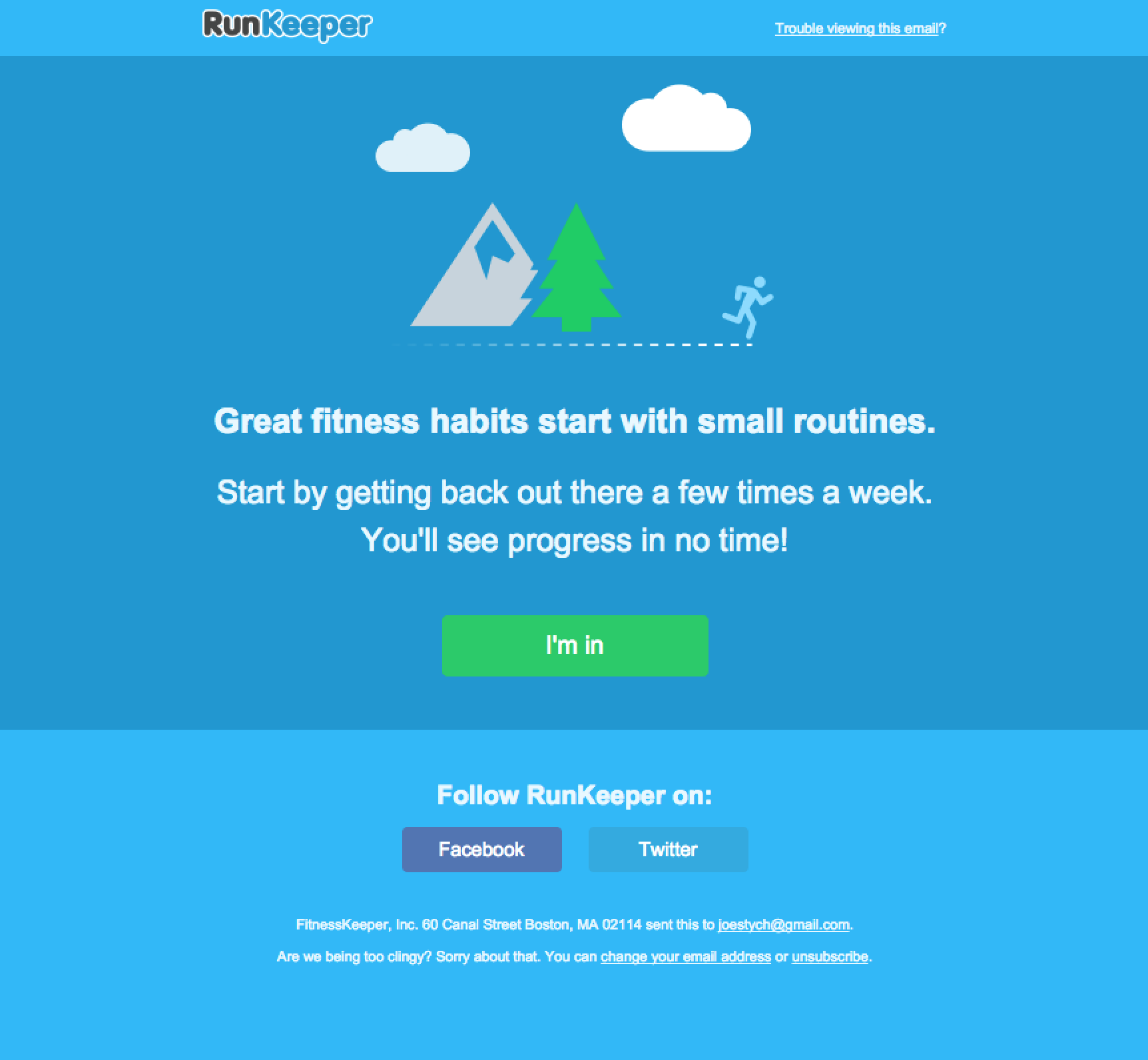 A co z wiosennym zachęcaniem do aktywności? To nic trudnego. Aplikacje takie jak Endomondo lub RunKeeper wykorzystują emaile do wzbudzenia zaangażowania oraz do kontaktu z marką, a wszystko pod przykrywką zdobywania kolejnych kilometrów. Tego typu zachęty to już norma wśród twórców aplikacji opartych na abonamentach. Warto zwrócić uwagę na zastosowanie personalizacji i ciekawe CTA poniższych wiadomości: