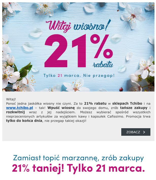 Warto też wykorzystać wiosenne święta: dzień kobiet, dzień matki czy – jak to zrobiła marka Tchibo – pierwszy dzień wiosny: