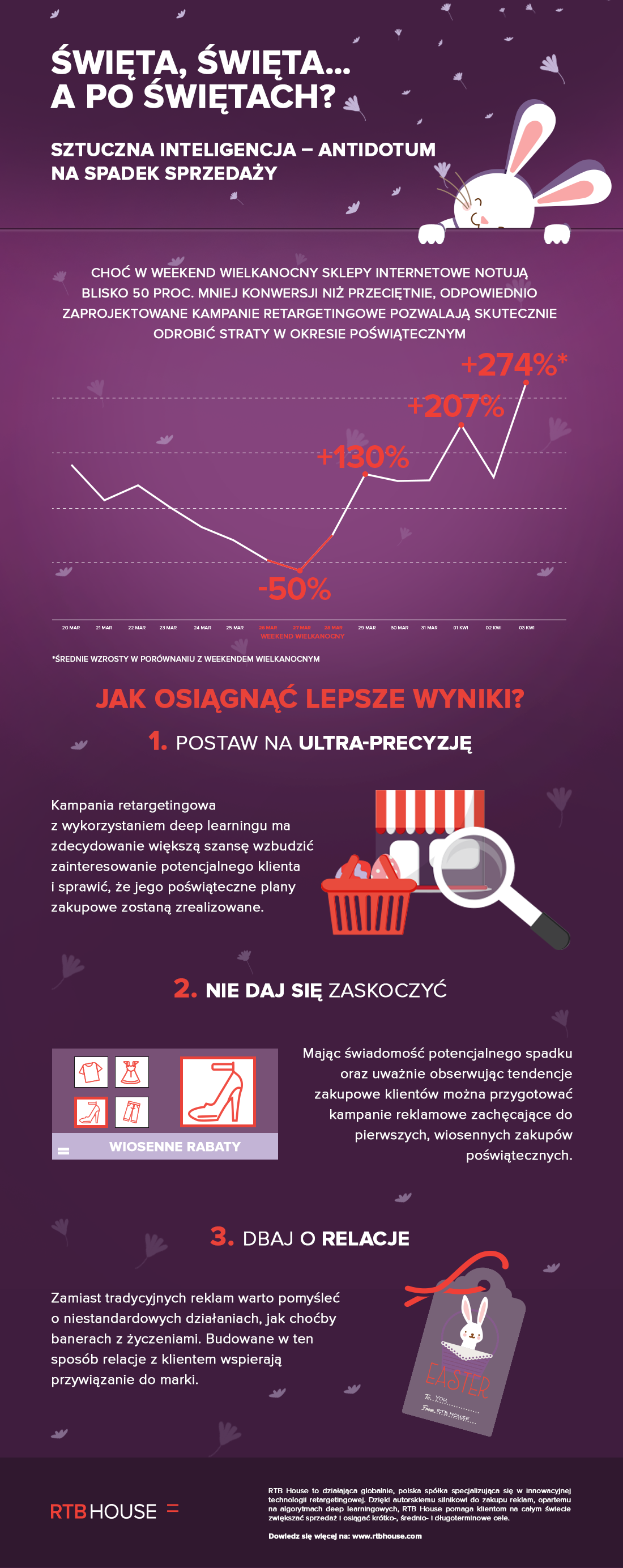 Jak zauważa Łukasz Abgarowicz, Business Development Director RTB House, weekend wielkanocny to 3 dni, w których wskaźnik konwersji jest zdecydowanie niższy niż przeciętnie. – Okres świąteczny to swego rodzaju wyzwanie dla e-sklepów. Kluczowe dla wyników sprzedażowych jest bowiem takie zaplanowanie działań reklamowych, by tych kilka dni nie wpłynęło negatywnie na całościowy rezultat. Mając świadomość potencjalnego spadku oraz uważnie obserwując tendencje zakupowe klientów można przygotować kampanie reklamowe zachęcające do pierwszych, wiosennych zakupów poświątecznych. Specjalnie zaprojektowane banery retargetingowe z informacją o wyjątkowych okazjach powinny nie tylko być dopasowane do użytkowników, ale także w jasny sposób komunikować ograniczony czas promocji – podkreśla Abgarowicz.