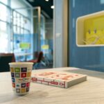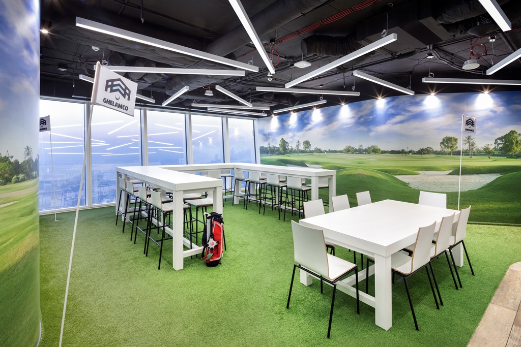 Kantyna to prawdziwa gratka dla amatorów golfa. Soczysta zieleń murawy pokrywającej podłogę została idealnie dopasowana do kolorystyki fototapet. No i ten widok! Kto nie chciałby podziwiać Warszawy z 41 piętra w przerwie na lunch.