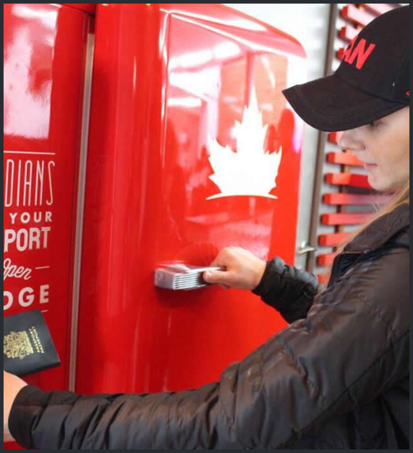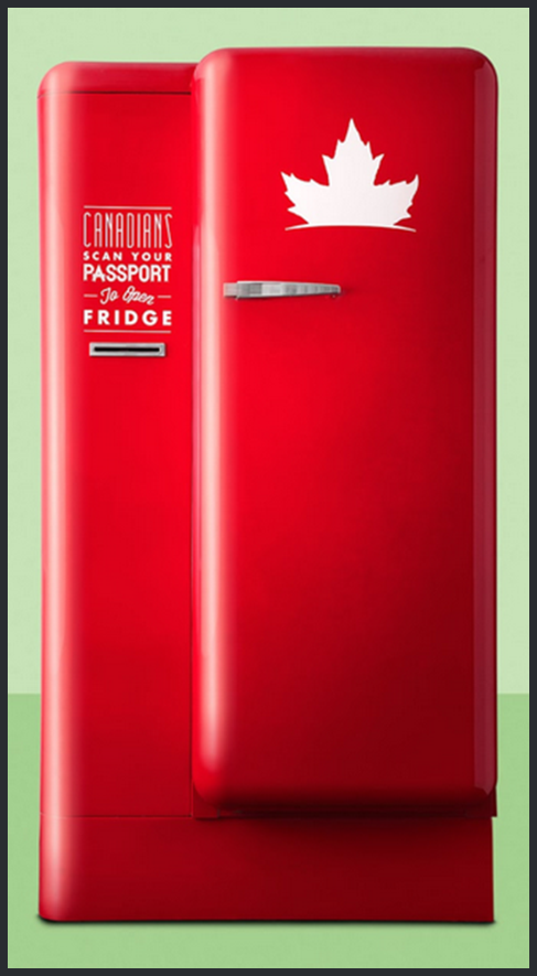 Kanadyjska marka piwa Molson Canadian przeprowadziła akcję ambientową w Europie. W paru lokalizacjach pojawiły się duże czerwone lodówki oznakowane logo Molson Canadian. Niestety lodówki – wypełnione dobrze schłodzonym piwem – były zamknięte, a otworzyć je mogła tylko osoba posiadająca kanadyjski paszport.