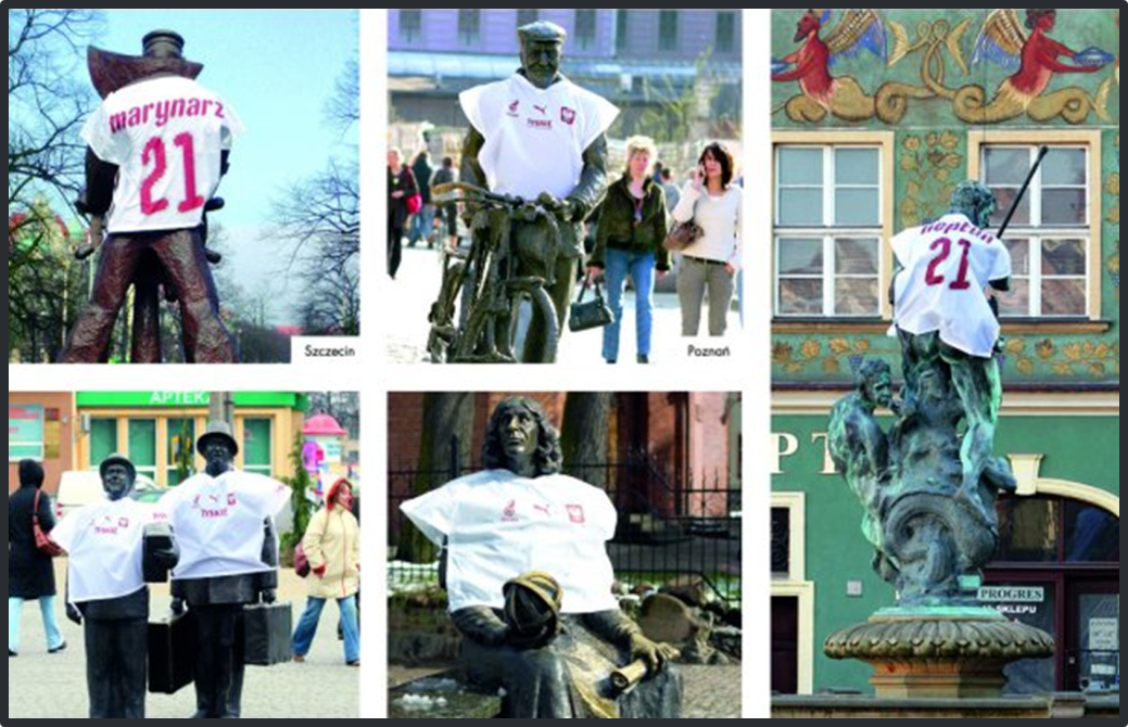 Browar Tyskie, sponsor trenera i reprezentacji Polski w piłce nożnej, prowadził mającą zachęcić do kibicowania naszej drużynie akcję „W Polsce nawet pomniki kibicują Naszym”. W ramach tego niekonwencjonalnego przedsięwzięcia znane monumenty w 9 miastach Polski zostały przyozdobione koszulkami reprezentacji narodowej.