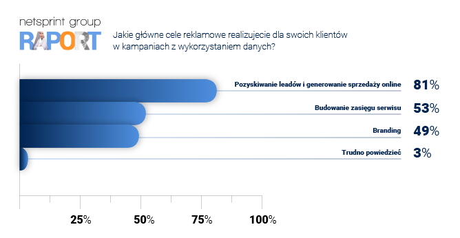 Z raportu „Data-driven marketing w Polsce” wynika, że reklamodawcy szeroko korzystają z danych zarówno w kampaniach efektywnościowych, zasięgowych, jak też budujących wizerunek. Głównym celem kampanii z wykorzystaniem danych jest pozyskiwanie leadów i generowanie sprzedaży online. W kampaniach prosprzedażowych danych używa aż 81% ankietowanych marketerów.