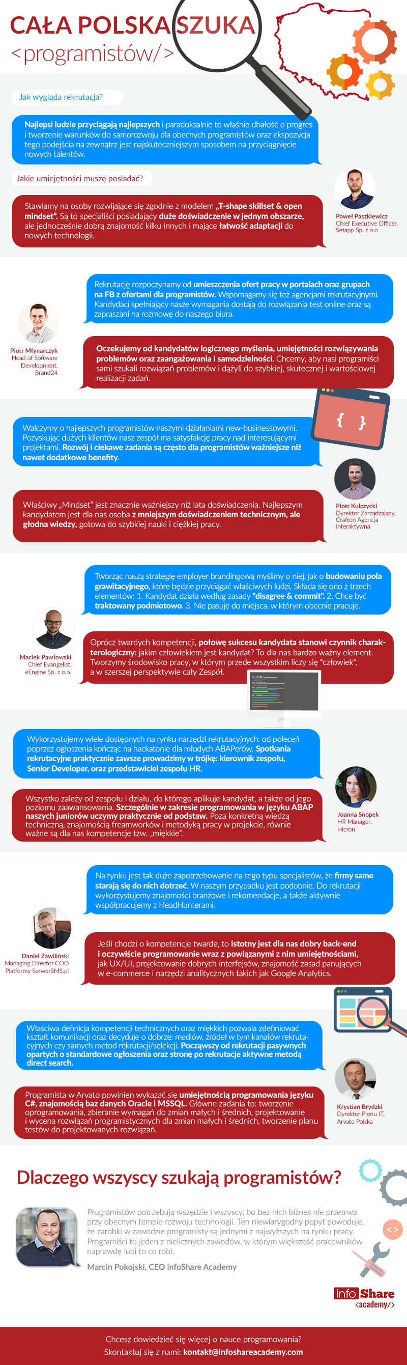 – W dzisiejszych czasach oprogramowanie znajdziemy w inteligentnych zegarkach, lodówkach czy samochodach. Programistów potrzeba wszędzie, bo przy obecnym tempie rozwoju technologii, biznes bez nich nie przetrwa. Szacuje się, że tylko w Polsce brakuje 50 tysięcy osób w IT – mówi Marcin Pokojski, CEO infoShare Academy, działający od 17 lat w branży IT, mentor w programach dla start-upów. – Zawód programisty daje nam miejsce na sporą kreatywność, a szybkie efekty codziennej pracy pozwalają często cieszyć się sukcesami. Dlatego programiści to jeden z nielicznych zawodów, w którym większość pracowników naprawdę lubi to co robi – dodaje.
