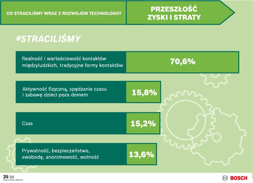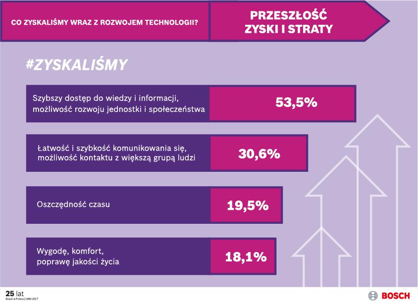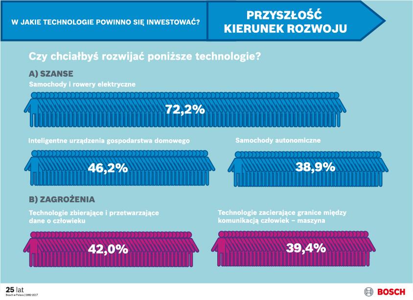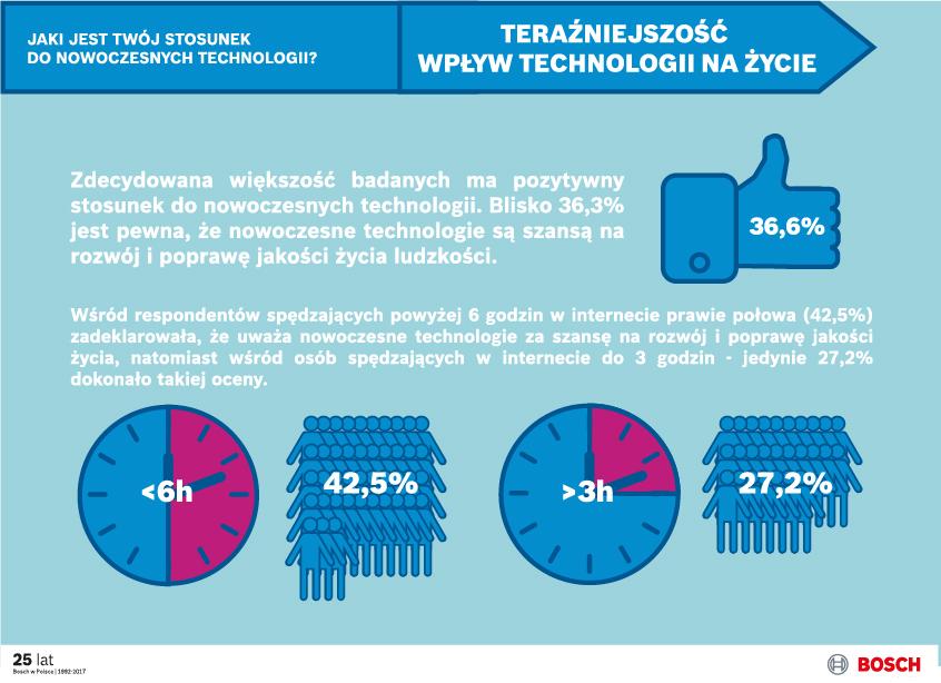 25-letni Polacy objęci badaniem zleconym przez firmę Bosch w Polsce posiadają zwykle wiele urządzeń zaawansowanych technicznie (smartfon, laptop, tablet, czytnik e-book, smartwatch) i są otwarci na nowe rozwiązania. Swój świat za kolejne 25 lat widzą jako sterowany zdalnie z jednego urządzenia, a może nawet kierowany myślami. Za podstawową wartość uważają bezpieczeństwo, dlatego przede wszystkim chcą wprowadzać takie rozwiązania techniczne, które wykluczają błąd ludzki i chronią środowisko. Fascynują się rozwijaną przez Bosch wizją autonomicznych samochodów, które będą mogły jeździć bez kierowcy, kosiarek, które same koszą trawnik, samochodów i rowerów napędzanych elektrycznie czy inteligentnych urządzeń używanych w gospodarstwie domowym.