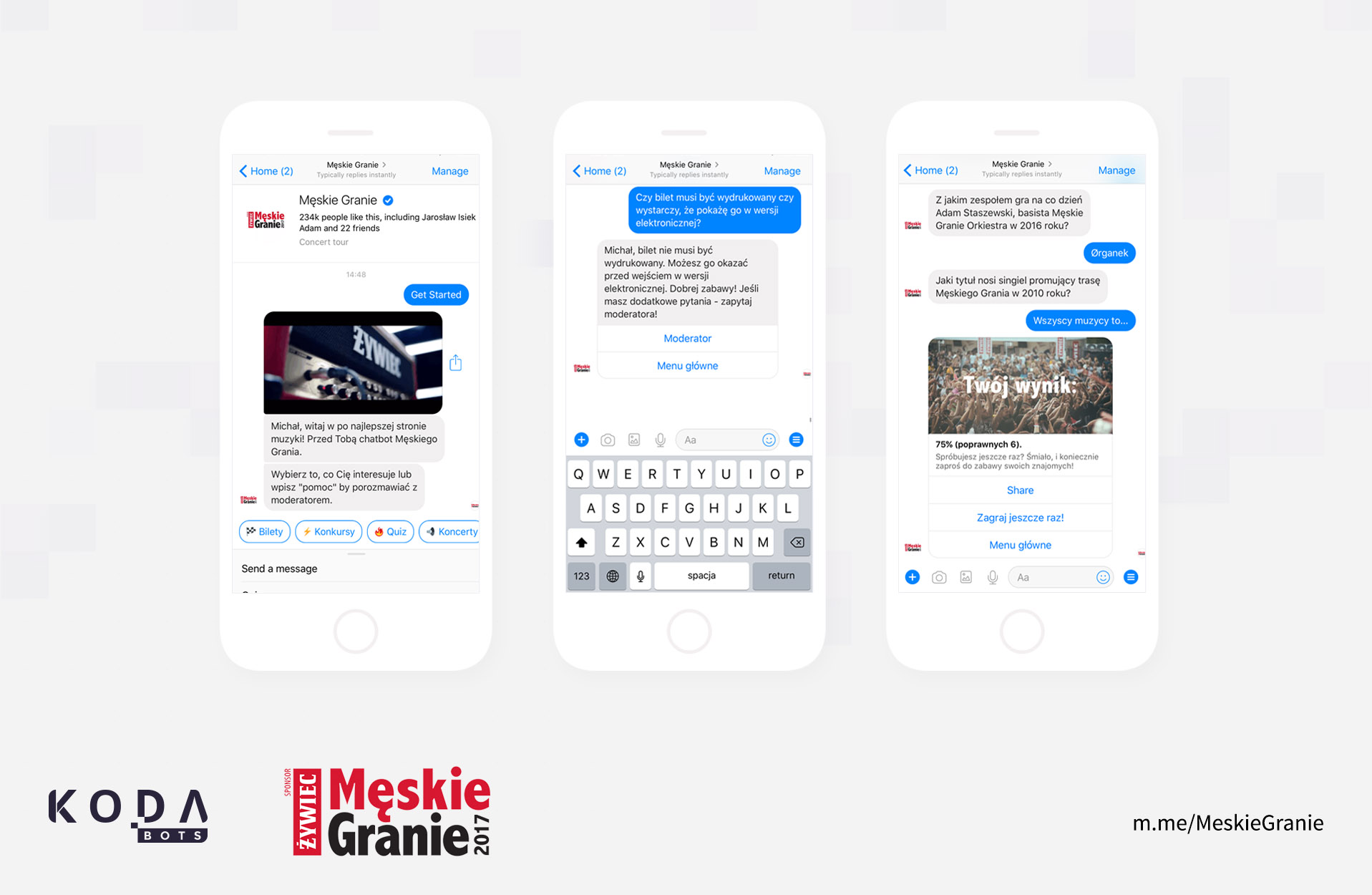 – Stworzyliśmy pierwszy tego typu eventowy chatbot w Polsce, zawierający zawsze aktualne informacje o koncertach, dostępności biletów, biogramy artystów, fotorelacje i quiz – mówi Mariusz Pełechaty, Head of Product w KODA Bots.