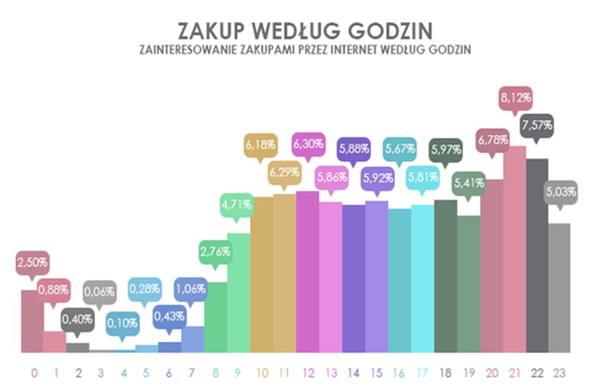 Mimo że Internet dostępny jest 24/7 okazuje się, że robiący za jego pośrednictwem zakupy uaktywniają się w określonych dniach i godzinach. Z danych Picodi.com wynika, że zakupy w sieci najczęściej robimy w poniedziałek i nasza aktywność na tym polu spada wraz z każdym kolejnym dniem. Największe zainteresowanie zakupami przez internet przypada w godzinach 10-12, czyli np. kiedy w biurze przeglądamy ulubione strony. Uaktywniamy się także w godzinach wieczornych (21.00-22.00), a więc już na koniec dnia, kiedy mamy czas dla siebie po wszystkich zawodowo-domowych obowiązkach.