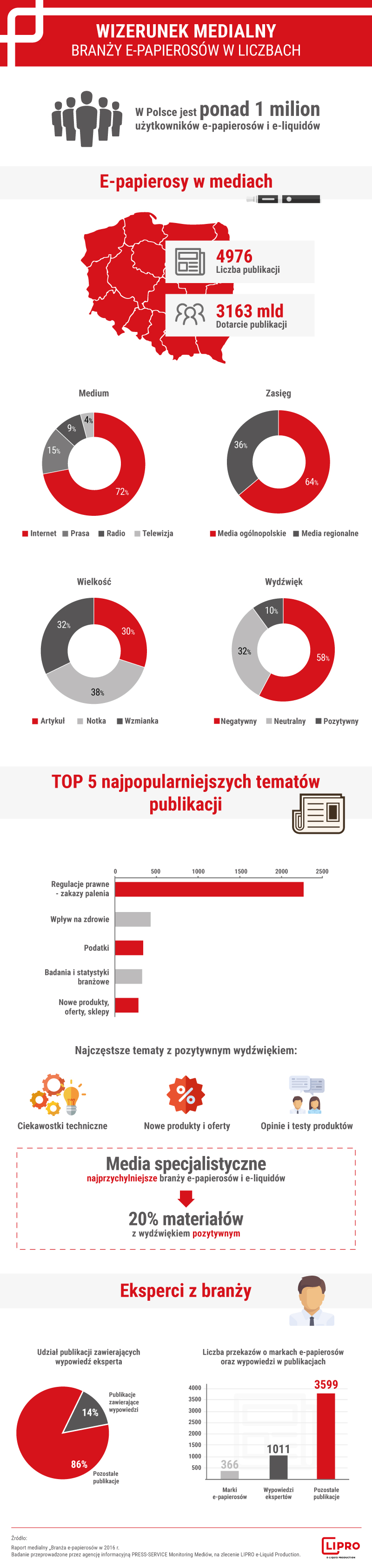 Z badania agencji informacyjnej PRESS-SERVICE Monitoring Mediów, przeprowadzonego na zlecenie firmy LIPRO e-Liquid Production, wynika, że na temat branży e-papierosowej w 2016 r. odnotowano łącznie 4 976 publikacji. Najwięcej z nich ukazało się w Internecie (72 proc.), następnie w prasie (15 proc.), radiu (9 proc.) i telewizji (4 proc.), w zdecydowanej większości w mediach o zasięgu ogólnopolskim (64%). Wielkość publikowanych materiałów rozłożyła się niemal równomiernie między artykuły (30%), notki (38%) i wzmianki (32%). Potencjalny kontakt z publikacjami dotyczącymi e-papierosów wyniósł ponad 3,163 mld.