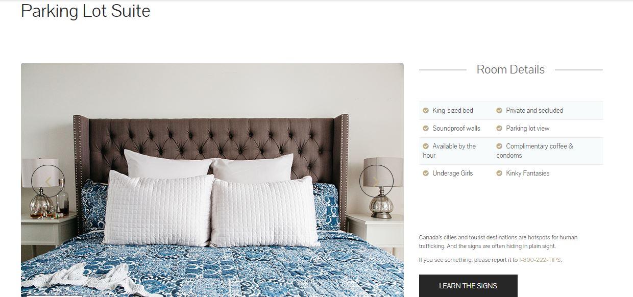 Na pierwszy rzut oka, kiedy przeglądamy stronę, wydaje się nam całkiem normalna, ale im więcej kliknięć zrobisz, tym zauważysz więcej niepokojących oznak. Zadziwiająco wiele dziewczyn, niedoświetlone pokoje, biustonosze na podłodze oraz kosze pełne prezerwatyw. Akcja ma pobudzić nasze umysły do szybkiego wykrywania i reagowania na objawy mówiące o przestępstwach na tle seksualnym lub handlu ludźmi.