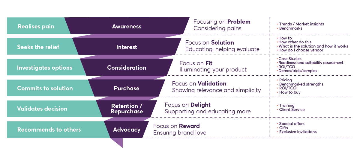 Leady znajdujące się na górze lejka sprzedażowego charakteryzuje niska świadomość potrzeby zakupowej – leady te zwykle nie rozumieją oferowanych im przez dostawców rozwiązań. Cel komunikacji zmienia się wraz z dojrzewaniem leada – począwszy od edukacji w zakresie trendów, benchmarków, przez zagadnienia dotyczące sposobów rozwiązywania problemów klienta, aż po te dotyczące cen, procesu wdrażania rozwiązań, czy kwestii finansowych: CAPEXu i OPEXu. Przykłady tematów komunikacji prezentuje poniższy schemat.