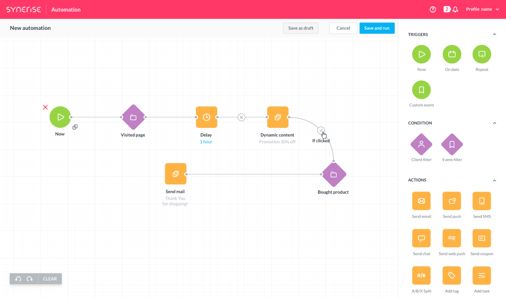 Moduł automatyzacji w rozwiązaniu Synerise. Przykład logiki automatyzacji.