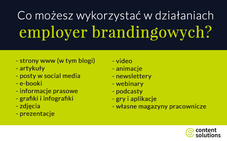 Poza ogłoszeniami rekrutacyjnymi, w employer brandingu wykorzystuje się wiele różnych rodzajów contentu i narzędzi, służących do jego dystrybucji.