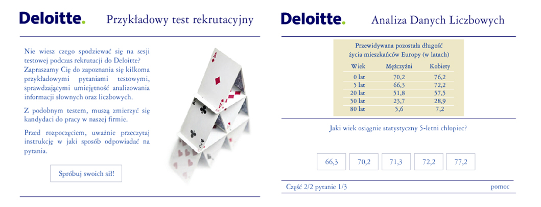 Publikowanie testów to świetny sposób na zachęcenie kandydatów do sprawdzenia swoich umiejętności, zanim złożą CV lub oswojenie ich z zadaniami, z którymi być może spotkają się w procesie rekrutacji. Na wprowadzenie ich zdecydowało się między innymi Deloitte.