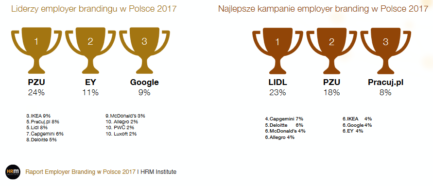 A kim są liderzy employer brandingu? Najbardziej aktywne na światowej scenie employer brandingowej są oczywiście duże brandy i korporacje – wystarczy wspomnieć chociażby Google, Deloitte, czy IKEA. Według wspomnianego raportu, w Polsce liderami są PZU, EY (Ernst & Young) oraz Google. Natomiast najlepsze kampanie EB wdrażane były przez Lidla, PZU oraz portal Pracuj.pl. Te marki warto śledzić i w ich działaniach szukać inspiracji do podjęcia własnych kroków.