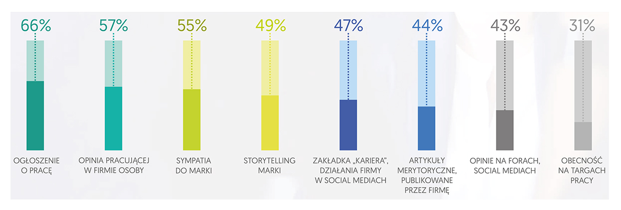 Pracodawca ma bezpośredni wpływ na kształt aż pięciu z tych czynników: ogłoszenie o pracę, storytelling marki, zakładka „kariera” i działania w social media, publikacje merytoryczne oraz obecność na targach pracy. Ale na pozostałe (sympatię do swojej marki oraz opinie na jej temat) może wpływać pośrednio poprzez pracowników oraz kulturę organizacji.