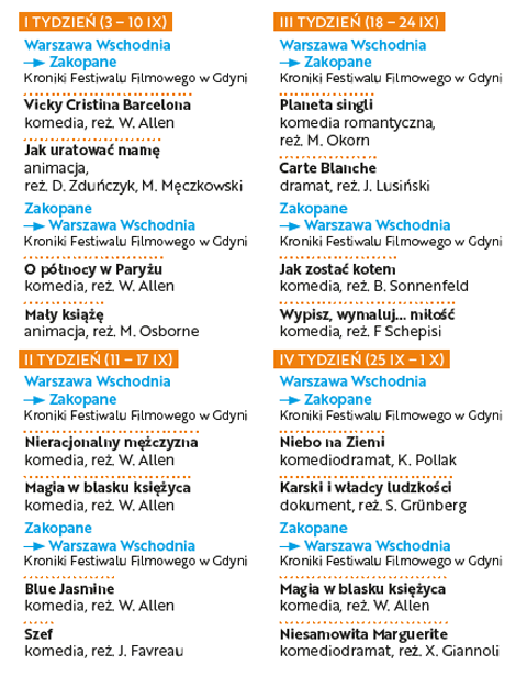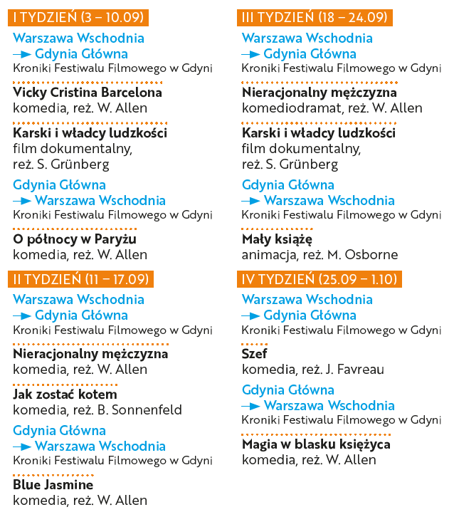 Podróżujący zobaczą między innymi słynne europejskie produkcje Allena, jak np. „O północy w Paryżu”, „Vicky Cristina Barcelona” , komedię „Szef”, czy wielokrotnie nagrodzoną polską animację „. Wszystkie filmy pochodzą z oferty dystrybucyjnej Kino Świat.