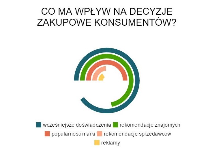 Liczna grupa ankietowanych wskazała także, że liczą się ze zdaniem innych, dokonując zakupu. Rekomendacjom i opiniom znajomych wierzy aż 72% badanych. Popularność marki, jej rozpoznawalność mają natomiast wpływ na decyzje zakupowe średnio co drugiej badanej osoby. Rekomendacje sprzedawców ceni sobie około 24% ankietowanych, a reklamy wpływają na decyzje zakupowe jedynie 16% badanych konsumentów.
