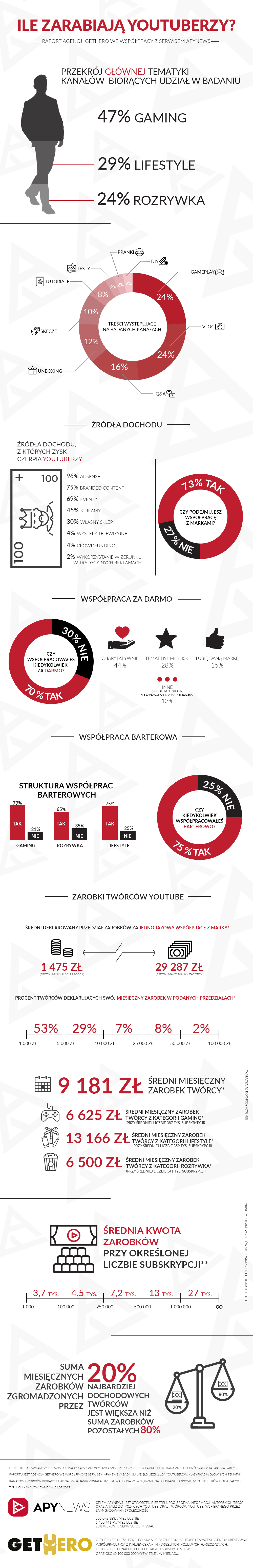 Twórcy raportu – agencja GetHero i portal APYnews, przebadali pulę 104 twórców działających na YouTube, reprezentujących różne typy kanałów i prezentujący różne treści wideo. Najpopularniejszą tematyką, którą zajmują się YouTuberzy, jest według tego badania gaming – blisko połowa z naszych badanych zajmuje się właśnie tym działem. Bardzo podobne wyniki uzyskują lifestyle i rozrywka – kolejno 29 i 24 procent respondentów reprezentuje takie typy kanałów. Najwięcej, bo po 24 procent treści występujących na badanych kanałach, stanowią gameplay’e oraz vlogi. Wśród popularnego kontentu można także wyróżnić Q&A, jak również unboxingi.