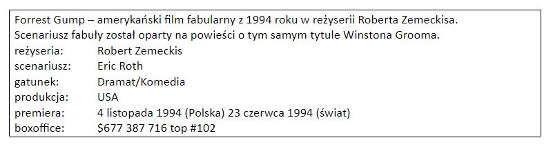 W ciągu trzech burzliwych dekad Forrest zmienia się z lekceważonego inwalidy w gwiazdę amerykańskiego futbolu; z bohatera wojny w Wietnamie staje się królem krewetek; od honorów Białego Domu przechodzi w ramiona ukochanej. Jest odzwierciedleniem naszej epoki, ostatnim niewinnym w czasach, kiedy Ameryka utraciła swoja niewinność. Serce podpowiada mu w sprawach, których nie ogarnie jego umysł. Jest człowiekiem zasad, a jego sukcesy inspirują wszystkich. Forrest Gump to historia pewnego życia.