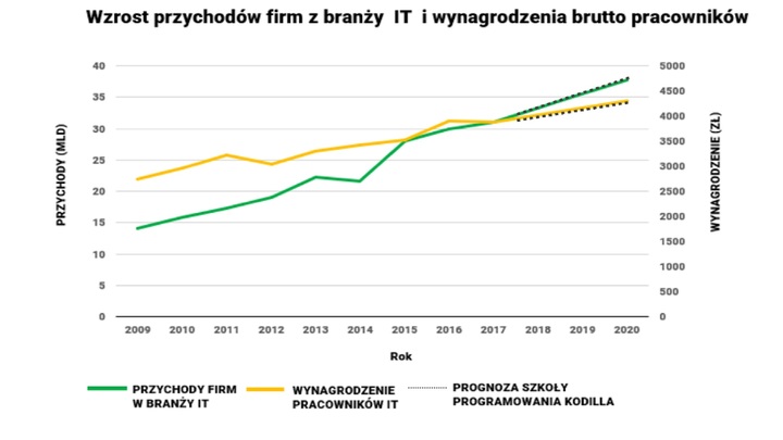 Mówi się, że wszystko co dobre, szybko się kończy – to jednak nie dotyczy tej branży. A dowodem są dane z GUS, zgodnie z którymi od 2009 do 2017 roku przychody firm z branży IT wzrosły o 16 mld złotych. Według prognoz ekspertów ze szkoły programowania online Kodilla.com, przy takiej tendencji, do 2020 roku przychody przedsiębiorstw z tego segmentu będą zwiększać się o ok. 10% rocznie, aby za nieco ponad 2 lata osiągnąć zawrotne 23 mld złotych. Co to oznacza dla rynku pracy?