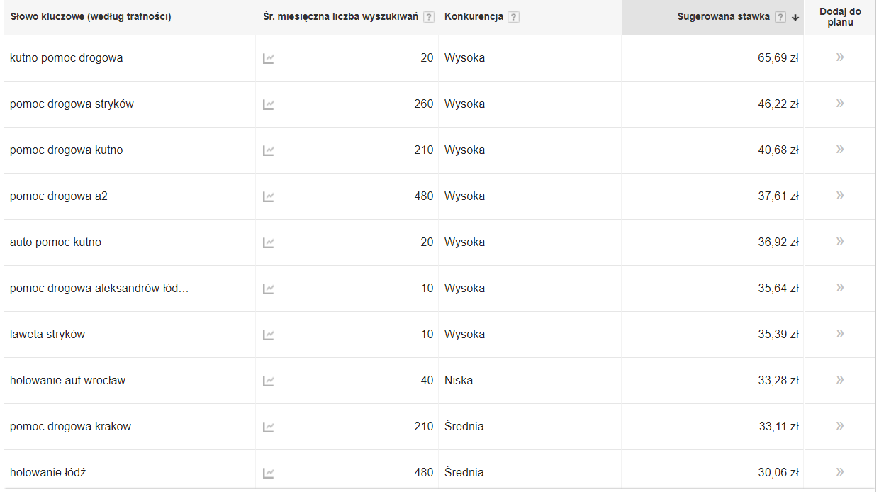 Jak widać na załączonym screenie z Google Plannera, sugerowane stawki dla teoretycznie rzadko wyszukiwanych fraz są horrendalnie wysokie – fakty są jednak takie, że w danych lokalizacjach o holowanie lub lawetę przy autostradzie jest trudno, a firmy holownicze zapewne dobrze kasują za obsługę takich miejsc, więc potencjalnie 40 czy 60 złotych za kliknięcie jest relatywnie niewielkim wydatkiem.